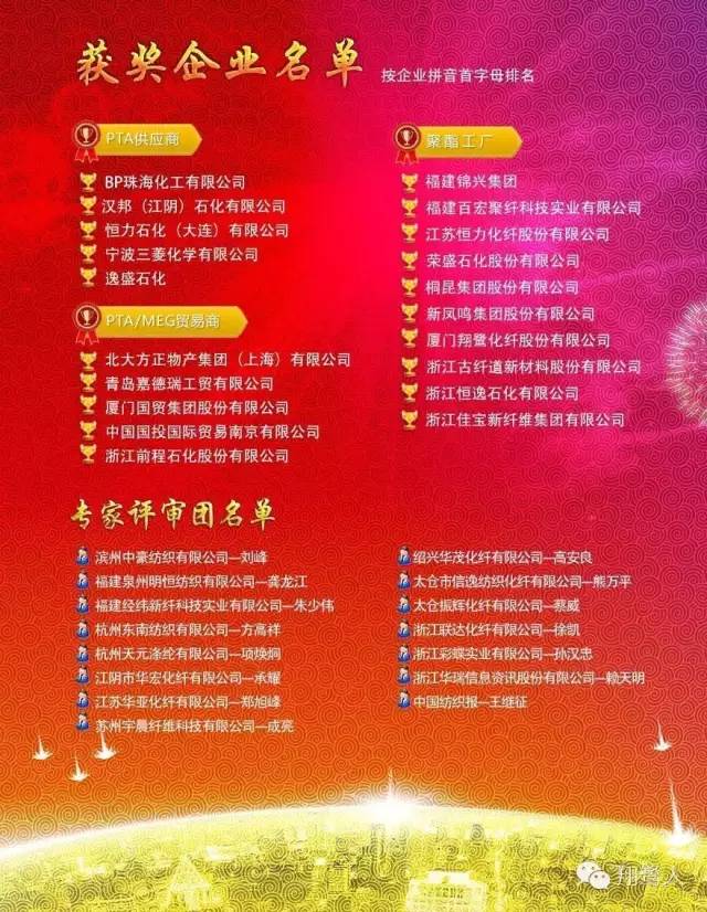 本次活動(dòng)由浙江華瑞信息資訊股份有限公司(中國(guó)化纖信息網(wǎng))主辦,旨在感謝在2015年度對(duì)中國(guó)聚酯行業(yè)做出重大貢獻(xiàn)的行業(yè)翹楚,經(jīng)過(guò)主辦方嚴(yán)格篩選,共有34家企業(yè)參與了PTA供應(yīng)商、聚酯工廠和PTA/MEG貿(mào)易商三個(gè)組別的評(píng)選。華瑞資訊官方微信“CCFinfo”對(duì)本次活動(dòng)進(jìn)行了全程跟蹤報(bào)道。據(jù)騰訊微信平臺(tái)投票情況統(tǒng)計(jì),投票微信頁(yè)面閱讀量超過(guò)20萬(wàn)人次,微信轉(zhuǎn)發(fā)14萬(wàn)人次,收到有效投票101736票(包括企業(yè)微信增值票數(shù)和專家團(tuán)投票)。同時(shí),有3.5萬(wàn)人次通過(guò)留言或直接回復(fù)的方式支持本次活動(dòng),受到了業(yè)界的廣泛關(guān)注。